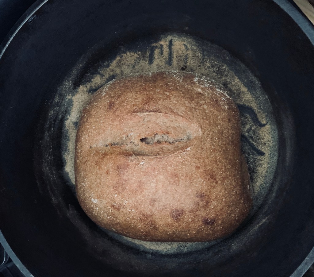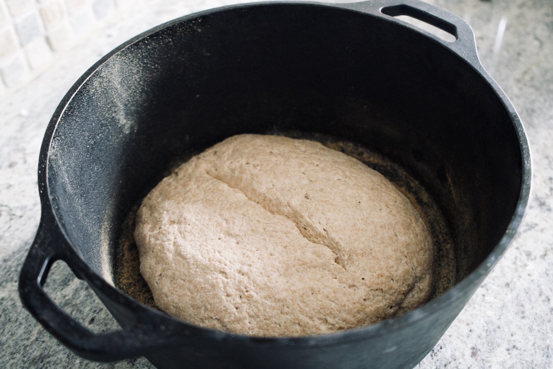 In the morning I preheated my dutch oven and my real oven to 475 degrees, floured my dutch oven, and gently flipped my risen dough in. Take a razor or sharp knife and ‘score’ your loaf with a ¼ inch deep incision at a 45 degree angled 6 inch straight line. I cooked with the lid on for 25 minutes, and then removed the lid for another 30 minutes.